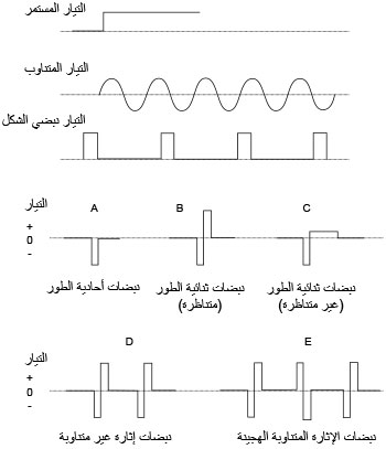 أ- التيار المستمر direct current: يستخدم لزيادة التروية الدموية ومعالجة الألم العصبي، ولا يستخدم في تنشيط التقلصات العضلية؛ لأنه يولد نفضات عضلية مع بداية موجة التيار ونهايتها فقط.