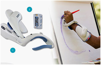 - تنبيه عضلات الطرف العلوي لفتح اليد وإغلاقها بهدفالإمساك بالأشياء. ويبين الشكل (5) أحد هذه الأجهزة وهو جهاز Bioness H200 المستخدم لهذا الغرض.