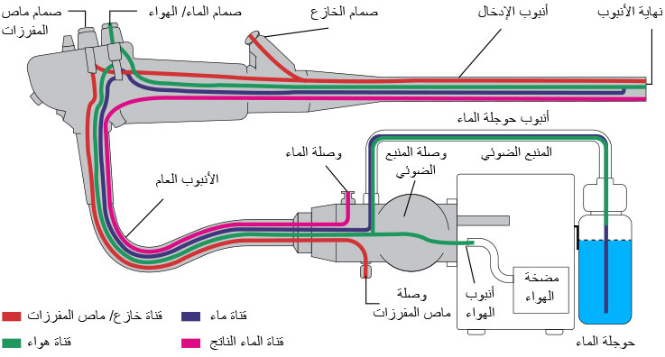 الشكل (16) منظومة الغسيل وضخ السوائل وشفطها المستخدمة في قناة الأدوات في المنظار المرن. |