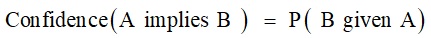 · مقياس الثقة Confidence: الذي يمثل احتمال حدوث RHS في حال حدوث LHS، ويحسب من العلاقة Support (LHS U RHS) / Support (LHS)، ويدل هذا المقياس على قوة التنبؤ Predictability power للقاعدة، فكلما كانت قيمته أعلى كانت نسبة نجاح التنبؤ أكبر. من أجل قاعدة ما تدل هذه الخاصية على الاحتمال الشرطي لكون A تعطي B؛ وباستخدام لغة الاحتمالات: