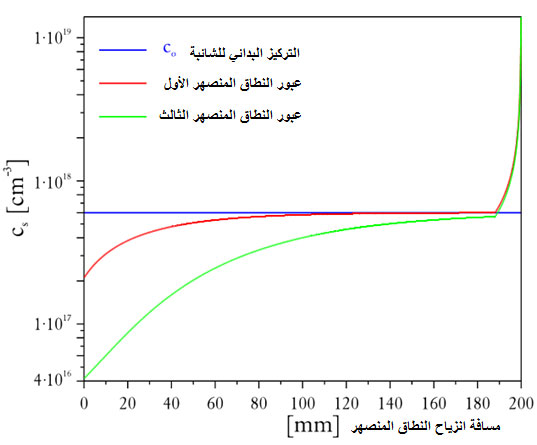 يبيِّن الشكل (4) تغير تركيز الشائبة B في المادة A بعد العبور الأول والثالث للنطاق حيث يلاحظ انخفاض تركيز الشائبة من 6x1017 cm-3 إلى 2x1017 cm-3، وإلى 4x1016 cm-3(Cₒ/15) بعد العبور الثالث للنطاق.