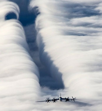 الشكل (2) الأثر الذيلي لطائرة ثقيلة تحلق فوق طبقة من الغيوم. |