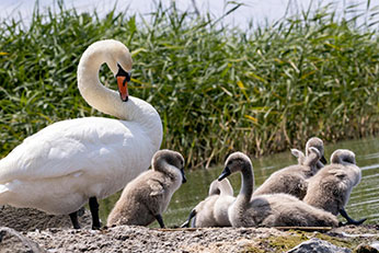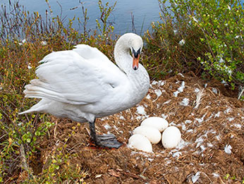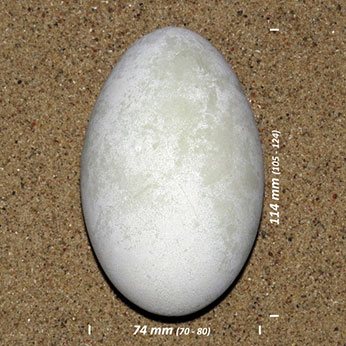 تبلغ أبعاد بيضة التم الأخرس 7.4× 11.7 سم، وقد يصل وزن الواحدة منها إلى 340 غراماً (الشكل 5). تبيض الأنثى عادة 6-8 بيضات، وتحضنها 5-6 أسابيع (34 - 45 يوماً) في أعشاش تبنيها على سطح الأرض قرب المواقع المائية، وقد يصل قطر العش إلى المتر، ويساعدها الذكر في ذلك عادة، على النقيض مما يُصادَف عند البط والإوز، كما يتناوب مع الأنثى في حضن البيوض (الشكل 6).