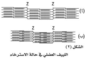 الشكل (2) اللييف العضلي في حالة الاسترخاء (أ)، وفي حالة التقلص (ب). يلاحظ تداخل خيوط الأكتين (الأفقية الرفيعة) مابين خيوط الميوزين (الأفقية العريضة نسبياً والحاوية على خطوط قصيرة عمودية)، ويلاحظ قصر المسافة ما بين خطي Z متتاليين في حالة التقلص بالمقارنة مع حالة الاسترخاء (حالة الراحة). |