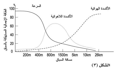الشكل (3) الأهمية النسبية للأكسدة اللاهوائية والهوائية للغليكوجين في الإمداد بالطاقة اللازمة لسباق رياضي تبعاً لمسافة السباق. يلاحظ من الشكل بأن الأكسدة اللاهوائية مسؤولة عن تقديم معظم الطاقة اللازمة للمسافات القصيرة (1500متر)، أما أهمية الأكسدة الهوائية للغليكوجين في تزويد الطاقة فتتأكد بمسافات السباق الأطول. |