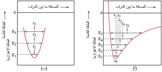 من الشكل (3). تكون هذه الاهتزازات توافقية harmonic vibrationبتقريب أول عند درجات الحرارة المنخفضة حيث تكون قوى الترابط بين الذرات خاضعة لقانون هوك Hooke’s law. ويكون منحني تغير طاقة الارتباط مع المسافة الفاصلة بين الذرات على شكل قطع مكافئ (الشكل3- ب)، وتكون هذه الاهتزازات مكماة فتدعى بالفونونات قياساً بتكمية الأمواج الكهرطيسية التي تدعى فوتونات، وبالتالي لا تحدث زيادة في حجم الجسم مع ازدياد درجة الحرارة، ويتوقع أن ينعدم معامل التمدد الحجمي بالقرب من الصفر المطلق. لكنه مع ارتفاع درجة حرارة الجسم تصبح هذه الاهتزازات غير توافقية anharmonic vibration، ومن ثمّ يكون تغير طاقة الرابطة غير توافقي مع تغير المسافة بين الذرات الشكل (3- أ) مما يزيد متوسط المسافة بين الذرات؛ ومن ثم التمدد الحراري للشبكة البلورية ثم للجسم كاملاً، فينشأ التمدد الحراري إذاً من تآثر الفونونات بعضها مع بعض. يمكن الإشارة إلى أنه كلما كان منحني تغير الطاقة الاهتزازية أكثر عمقاً وأقل عرضاً كانت طاقة الارتباط بين الذرات أكبر، ومن ثمّ يكون معامل التمدد الحجمي أصغر.