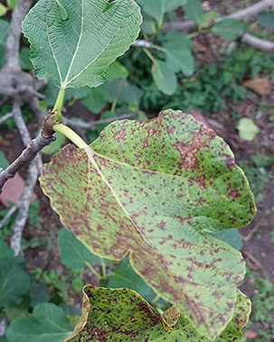 ومن أهم الأمراض الفطرية والفيروسية التي تصيب التين في المقام الأول: الصدأ (بقع برتقالية، تساقط الأوراق) (الشكل 5)، والتسمم الداخلي (اسمرار داخلي، ينتشر عن طريق الدبابير) (الشكل 6)، وفيروس موزاييك التين (تبقع/تشوه الأوراق (الشكل 7). وتقرح جذوع التين وأغصانه.